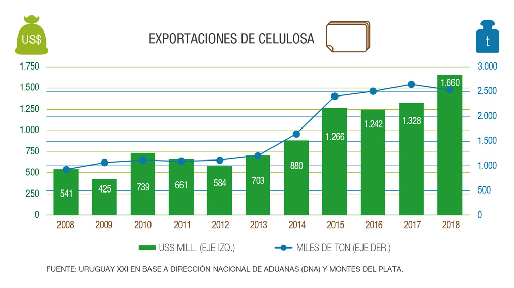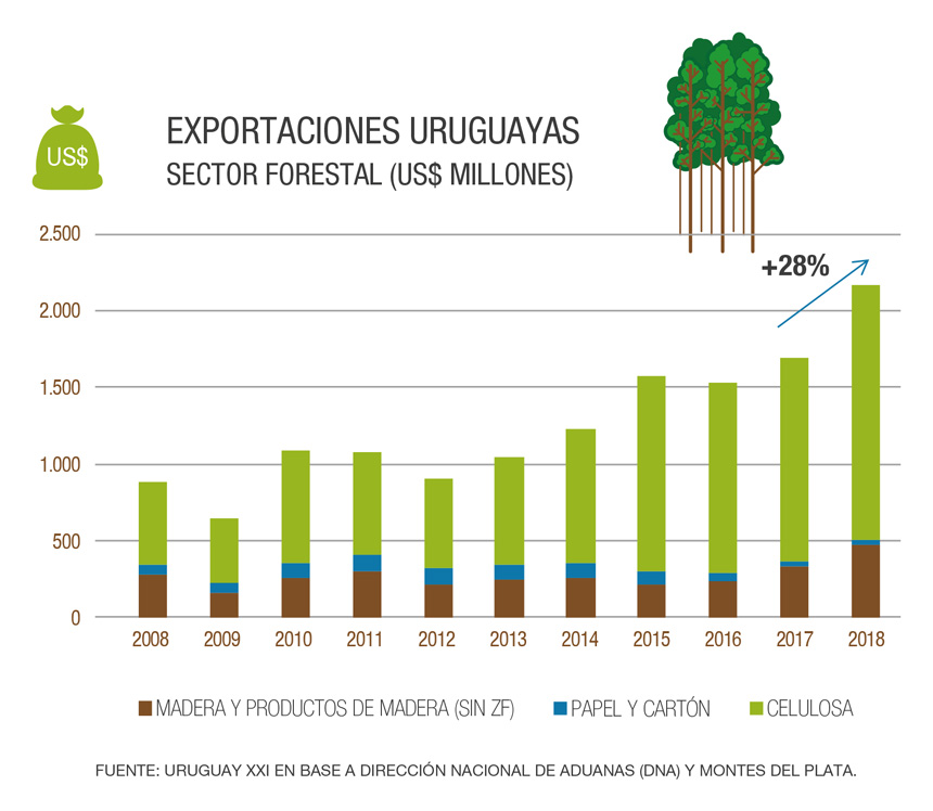 Por Lucía GastañagaLa importancia del sector forestal en las exportaciones uruguayas fue creciendo sin pausa y sin prisa, tanto en madera como en celulosa. Hasta que en 2018 se dio un hito: la celulosa aumentó un 25% su exportación con respecto a 2017 y así se transformó en el principal producto de exportación de Uruguay.